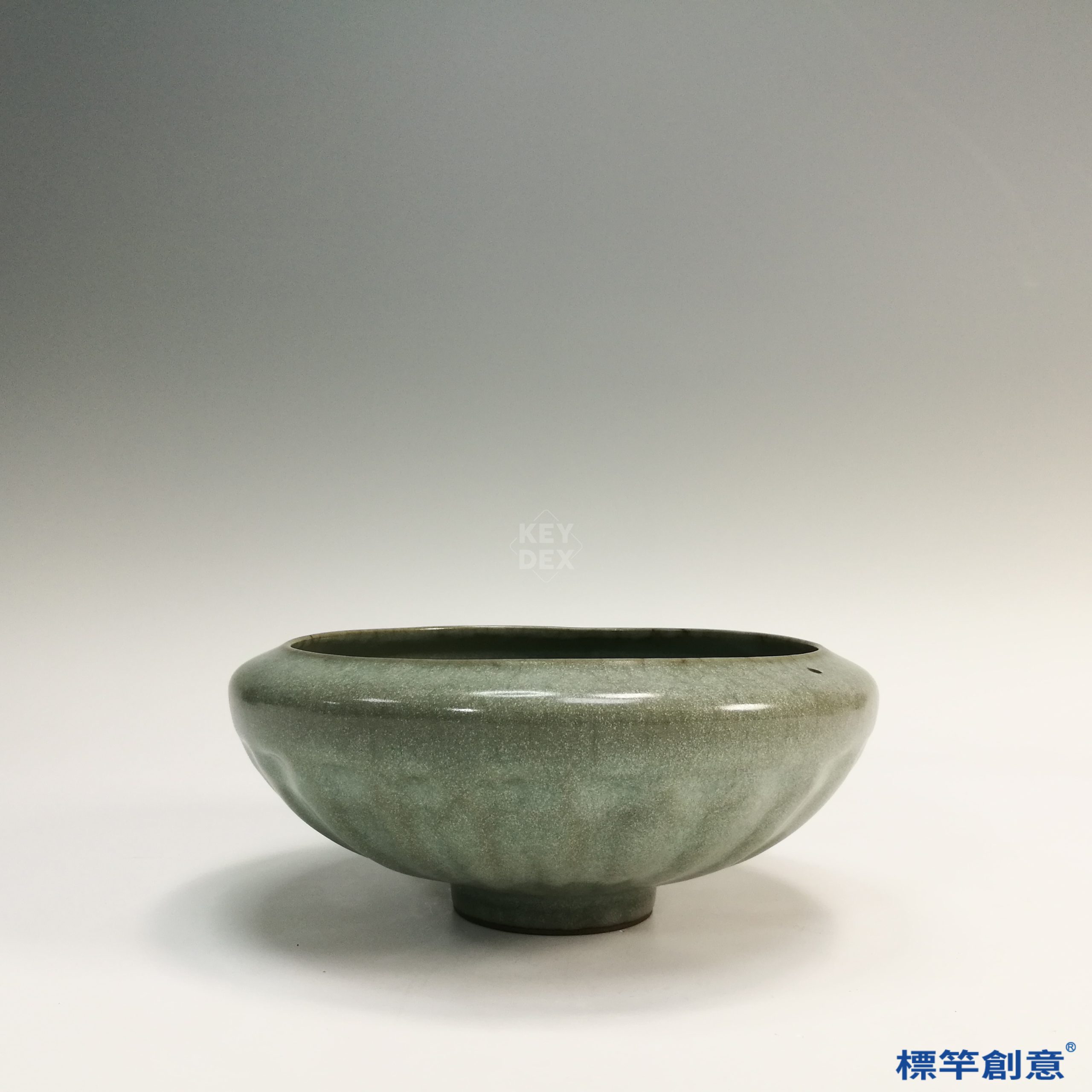 器表通體施灰藍釉,釉色淡雅沉穩,色澤富層次變化。外壁飾以淺刻蓮瓣紋,分佈齊整對稱,細節溫婉含蓄,釉下刻劃清晰。釉面略見細密開片,展現高溫釉瓷之自然紋理。