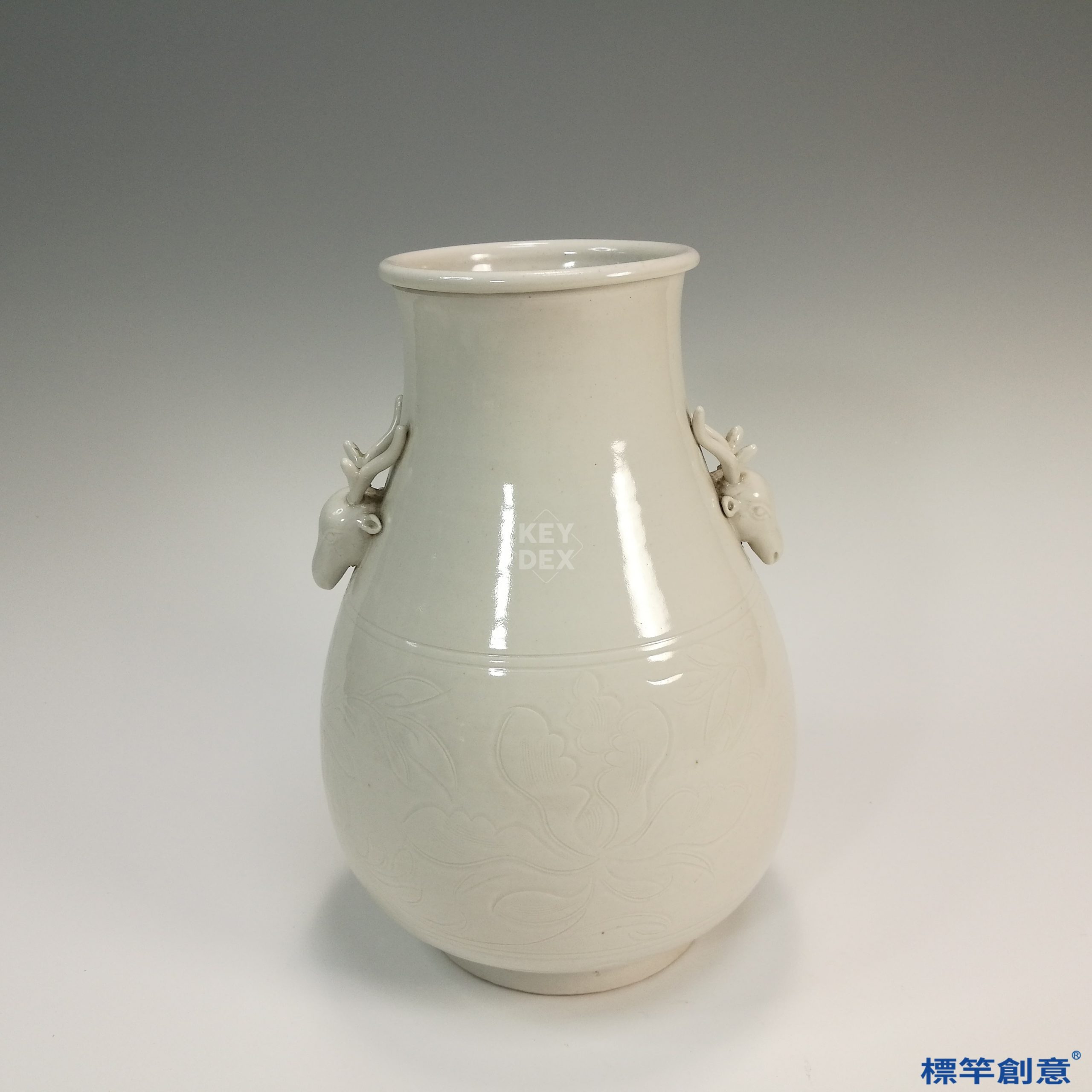 通體施白釉,釉色潔白潤澤,光感柔和。腹部主體飾刻蓮花紋,花瓣層疊清晰,線條流暢,刀法穩健,具清代晚期精細刻花之特色。鹿首耳裝飾立體感強,象徵祥瑞安康。器內亦施釉,底露胎,見旋修痕跡。