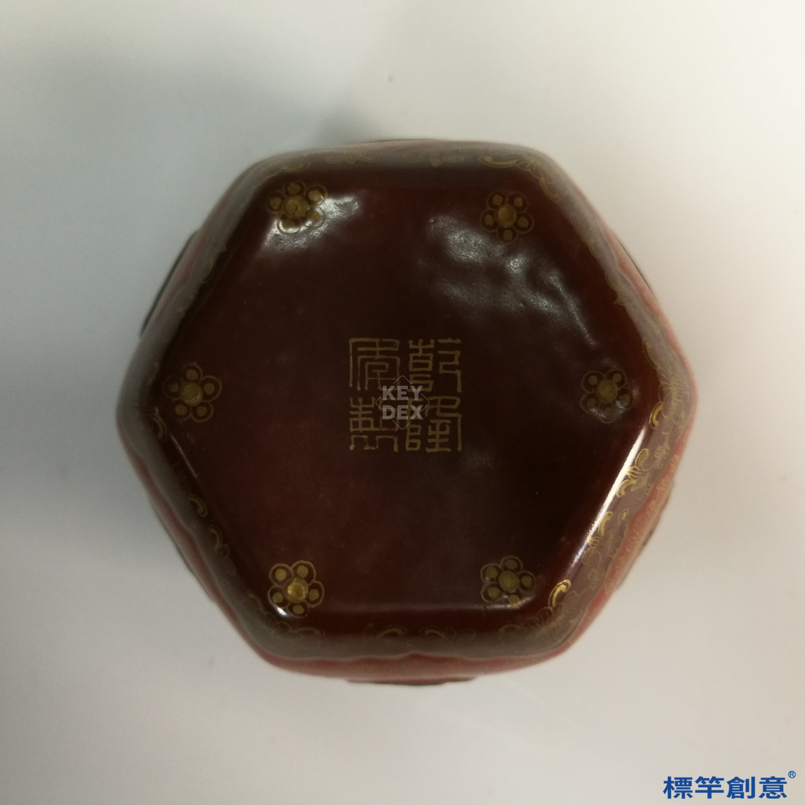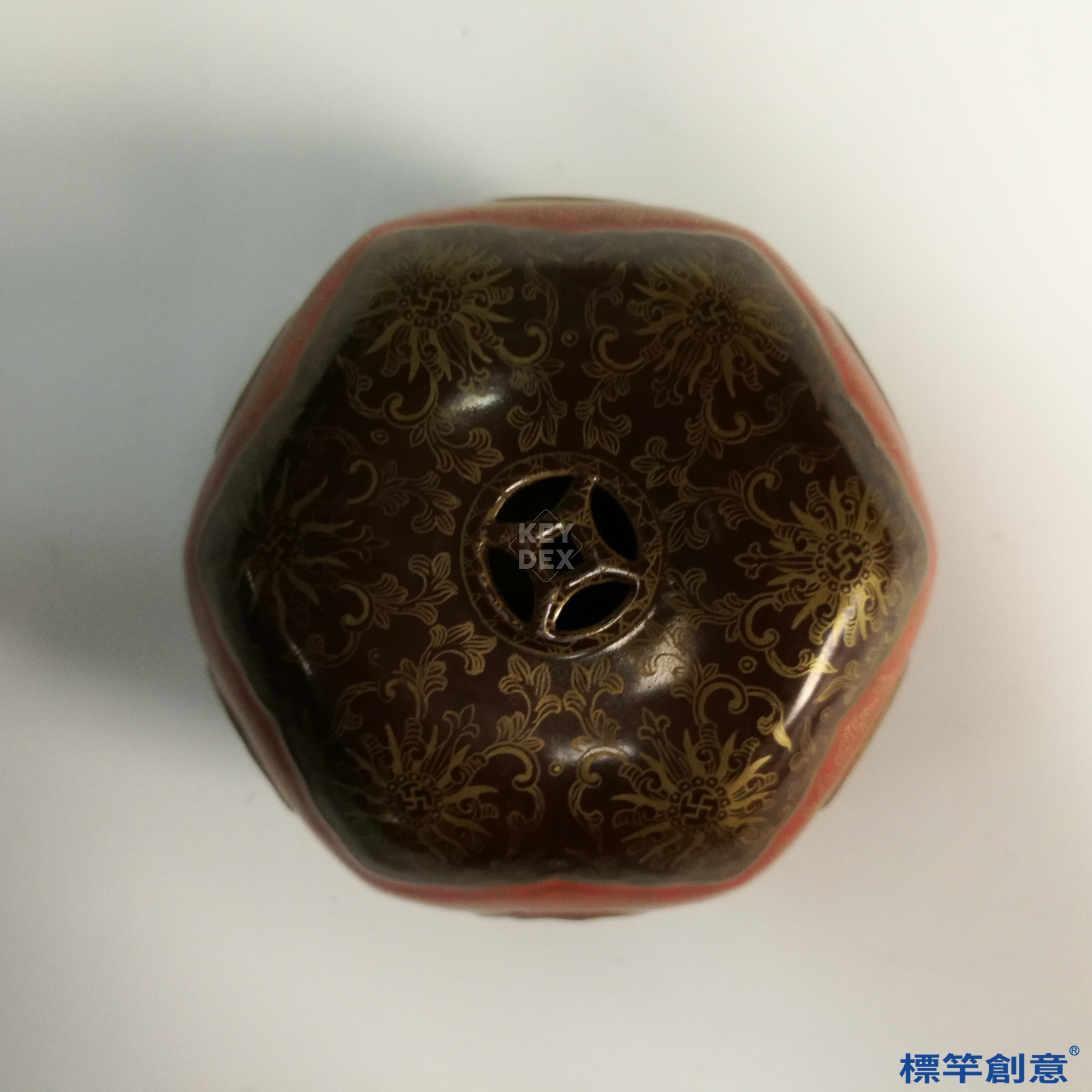 器身通體施鮮紅釉,發色均勻艷麗,表面飾以描金紋飾,主體鏤空龍紋穿插於四周結構間,鏤空工藝繁複精巧,金彩描繪細緻。紅釉與金彩相映成輝,華美非凡,鏤空紋飾利於透氣與導氣功能。