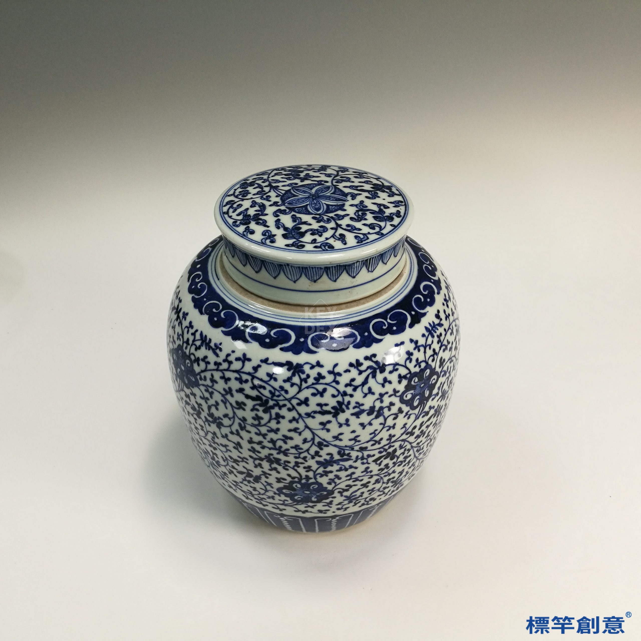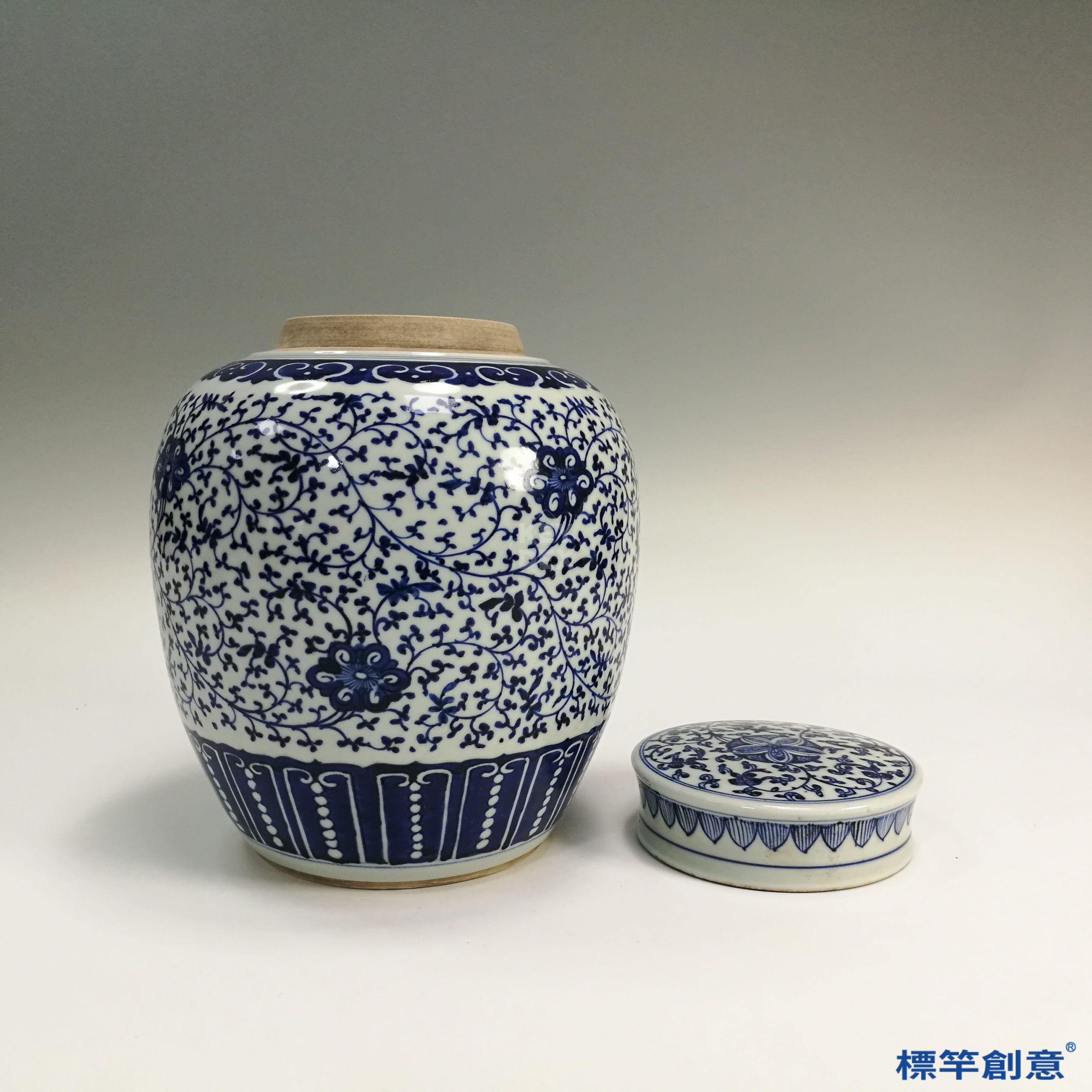 器身與蓋分段成型,乾燥後以鈷料繪青花紋飾,再施透明釉,高溫氧化焰一次燒成。青花屬釉下彩工藝,經高溫後釉色融入胎釉,永不褪色,釉質與彩繪一體。