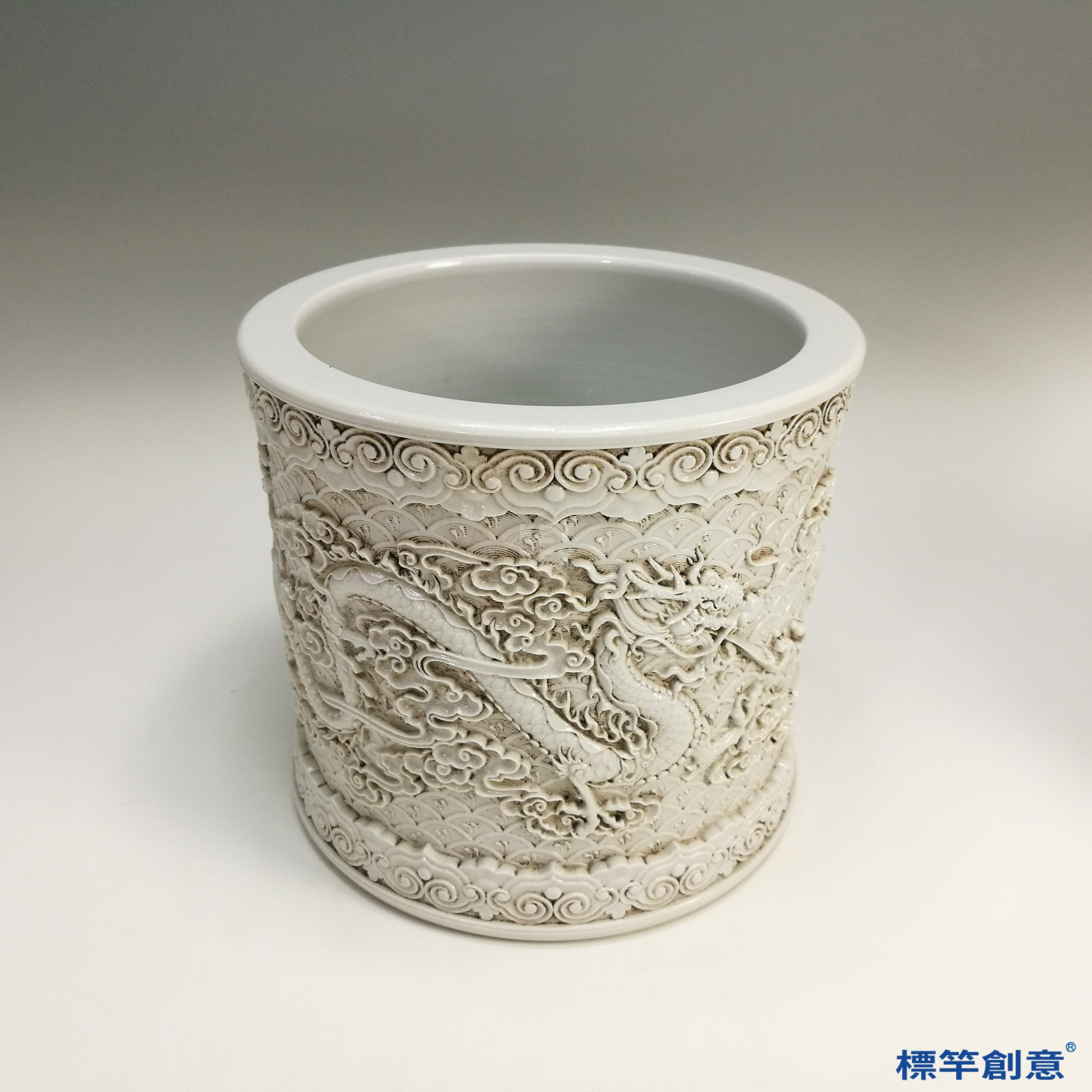 IA044 清代白釉仿王炳榮款文房雙龍戲珠筆筒