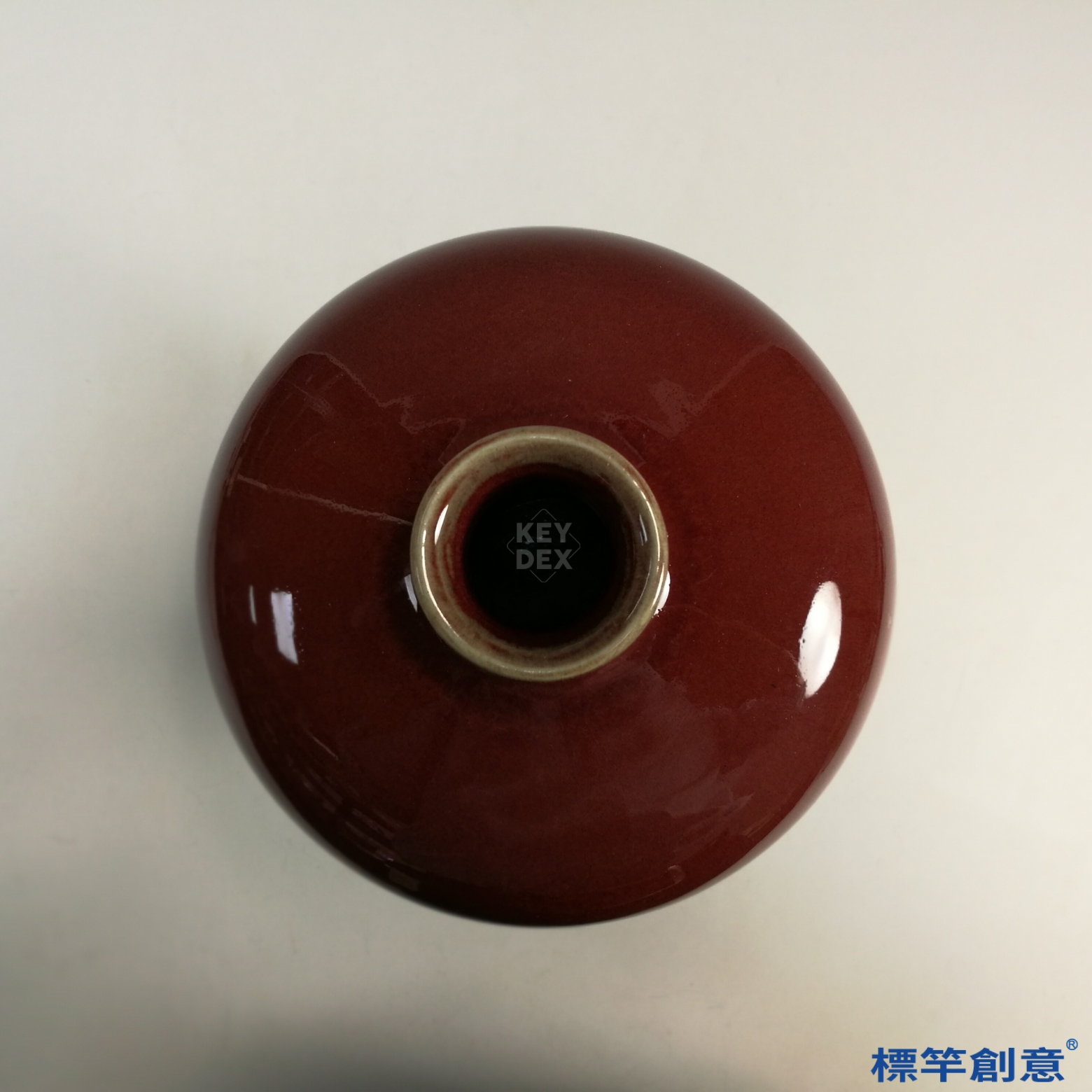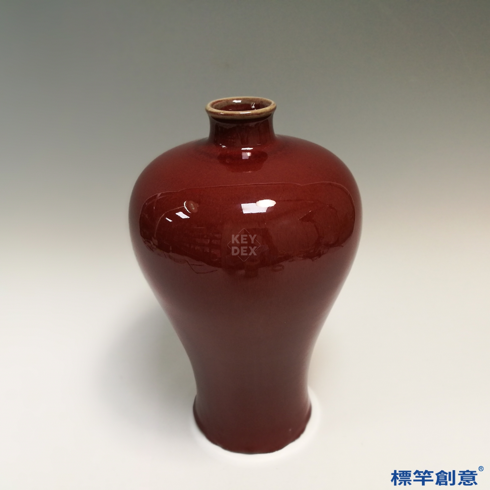 器形拉胚成形後細緻修整,施以含銅釉料,在還原焰環境中高溫燒成,燒製難度高,溫度、氣氛與銅量控制須臻精準,方能得此豇豆紅釉之雅致效果。