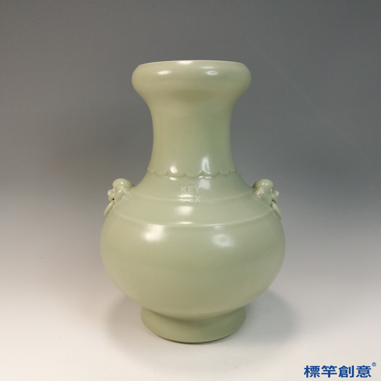 器體拉坯成形後,於肩部貼塑獸耳及掛環,經修整乾燥後施豆青釉,入窯高溫還原焰燒製。因釉色淺淡,燒成控制要求極高,須精準調控氣氛與溫度。