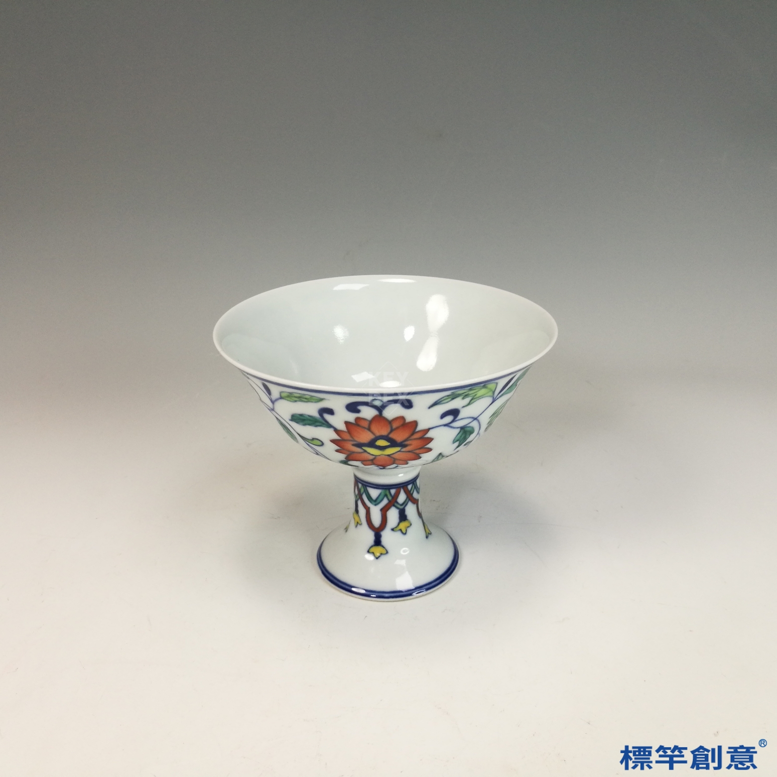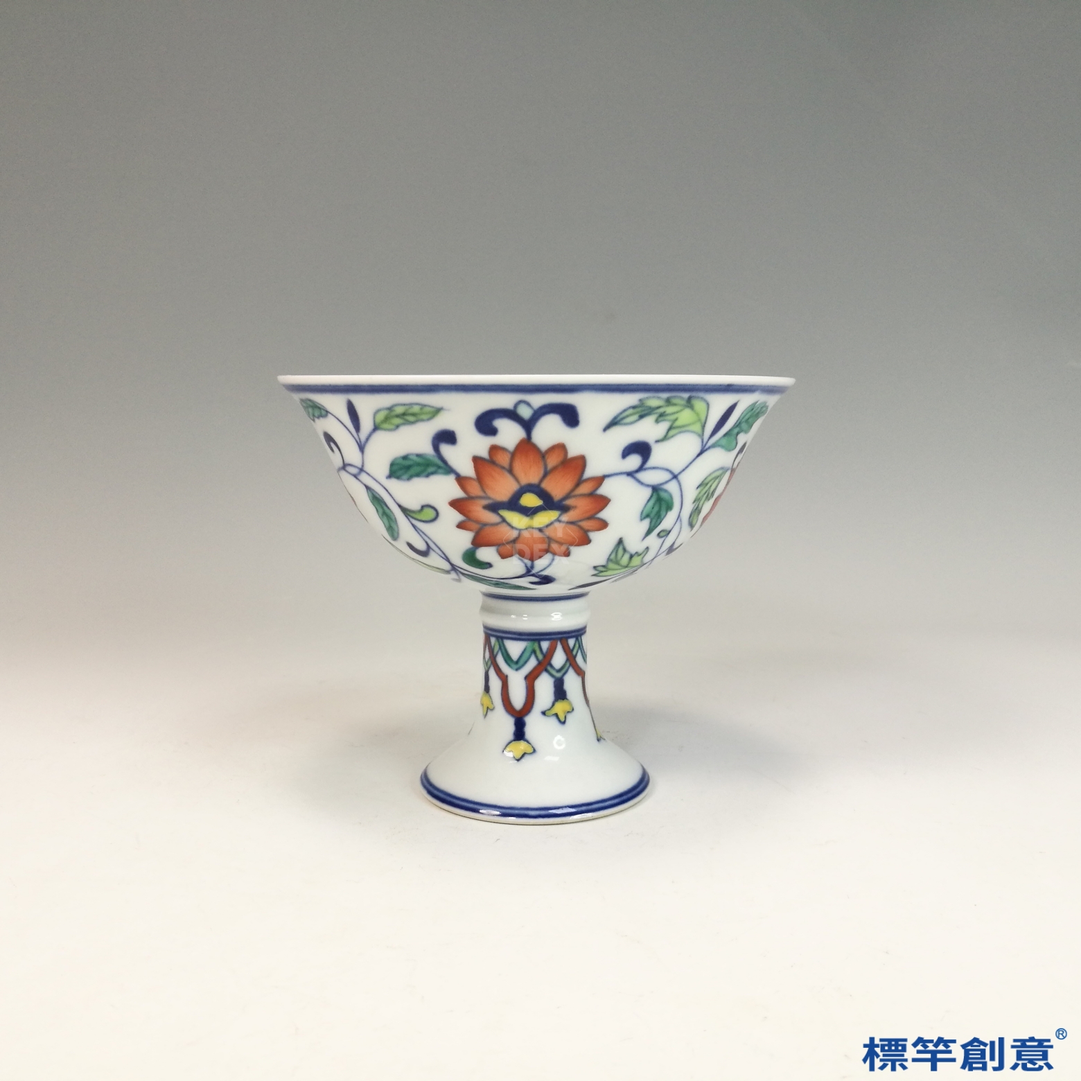 通體以鬥彩工藝裝飾,先以釉下青花勾勒紋樣,再施釉後以礬紅、黃、綠、紫等釉上彩繪纏枝花卉紋。紋飾纖細流暢,構圖疏朗對稱,彩色層次分明。高足部分亦飾纏枝紋,呼應杯身主題。