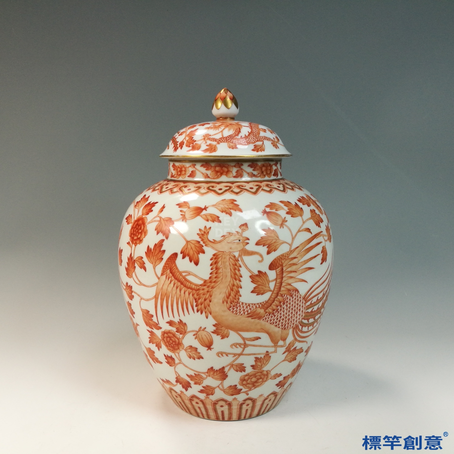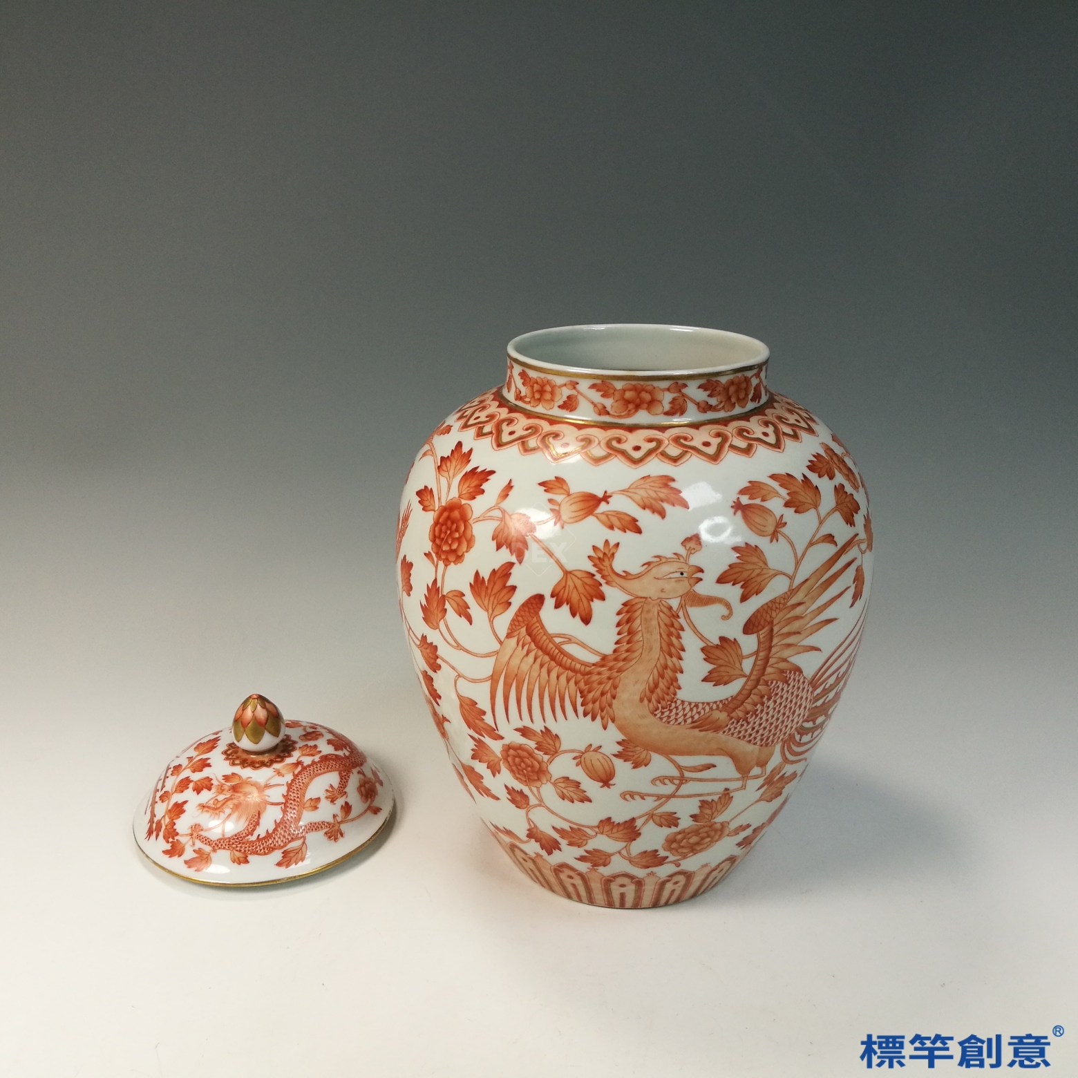 通體施礬紅釉,釉色沉穩典麗,局部以金彩描繪五爪金龍與鳳凰騰飛於火焰雲氣之間,構圖對稱、紋線清晰,描金細膩厚實,反映高超官窯技藝。蓋身相應裝飾,整體莊嚴華美。