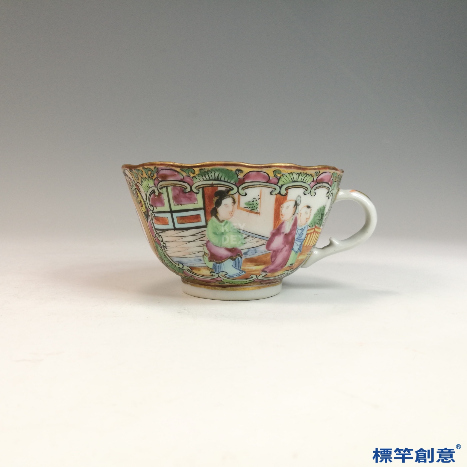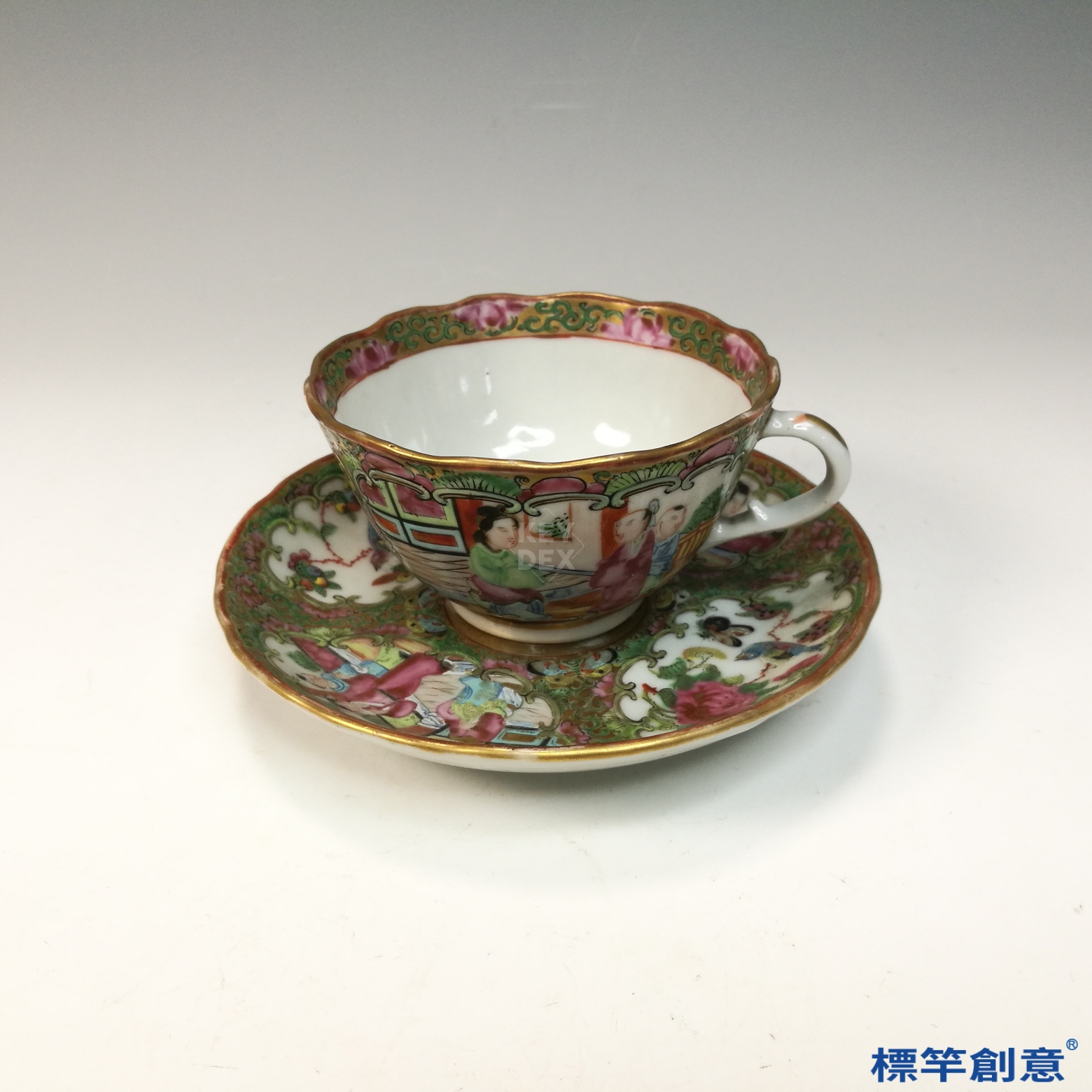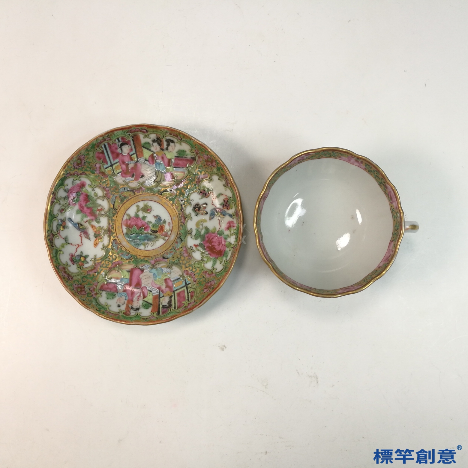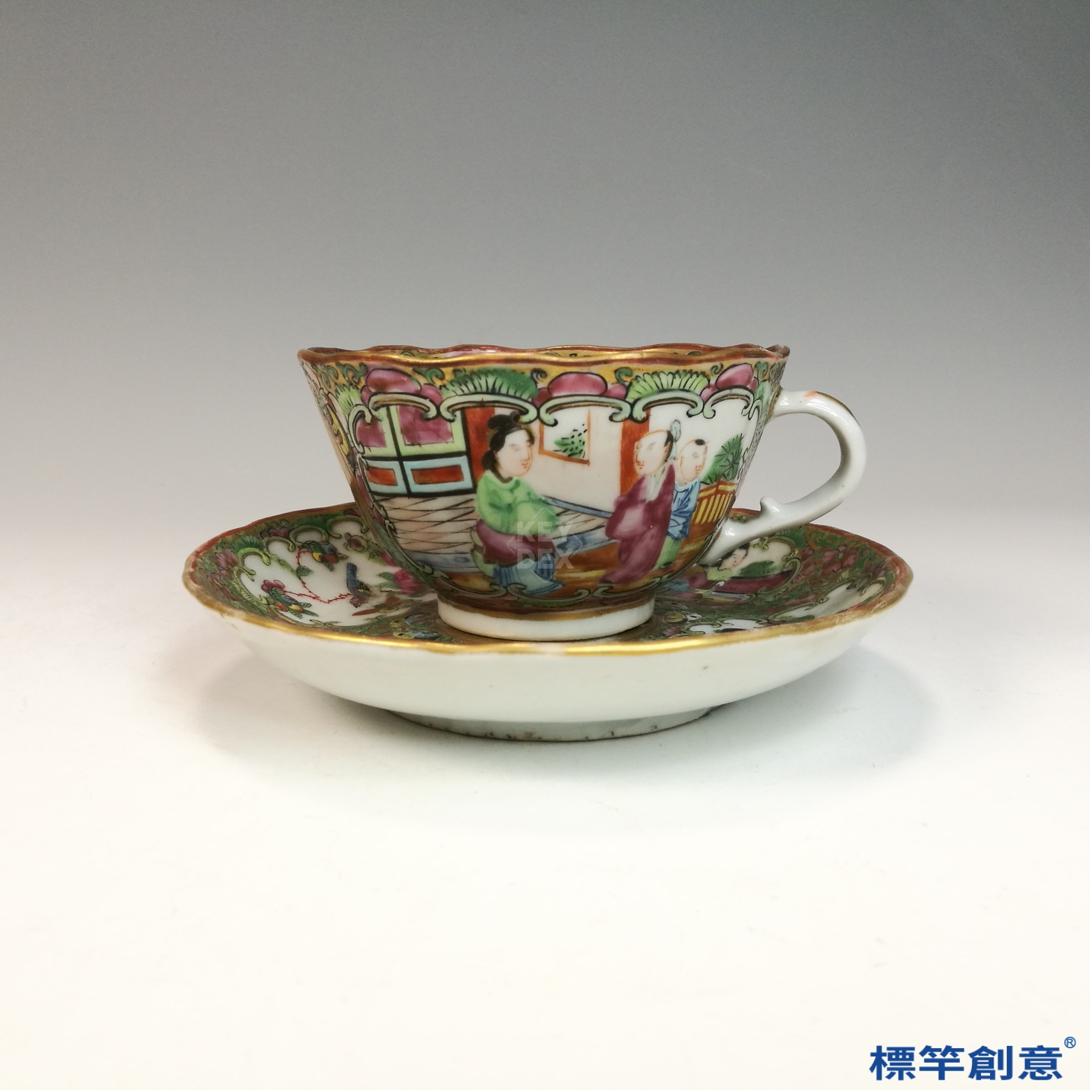 IA071 清代同治廣彩人物故事花口描金外銷咖啡杯托盤一套
