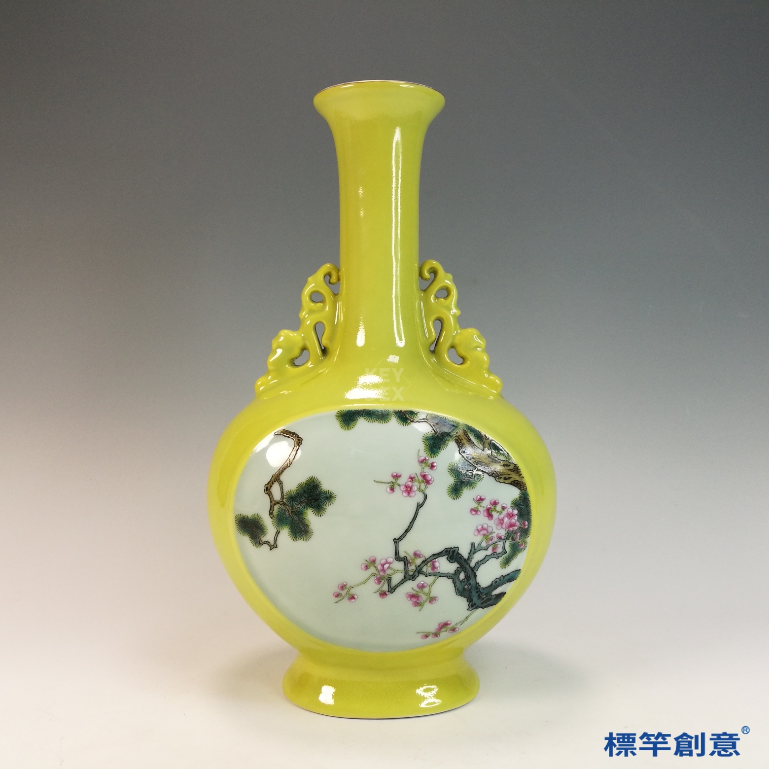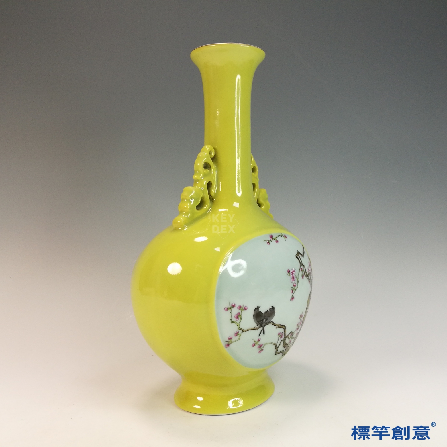 IA084 清嘉慶淡黃地開窗琺瑯彩繪花鳥紋乾隆款雙耳扁瓶