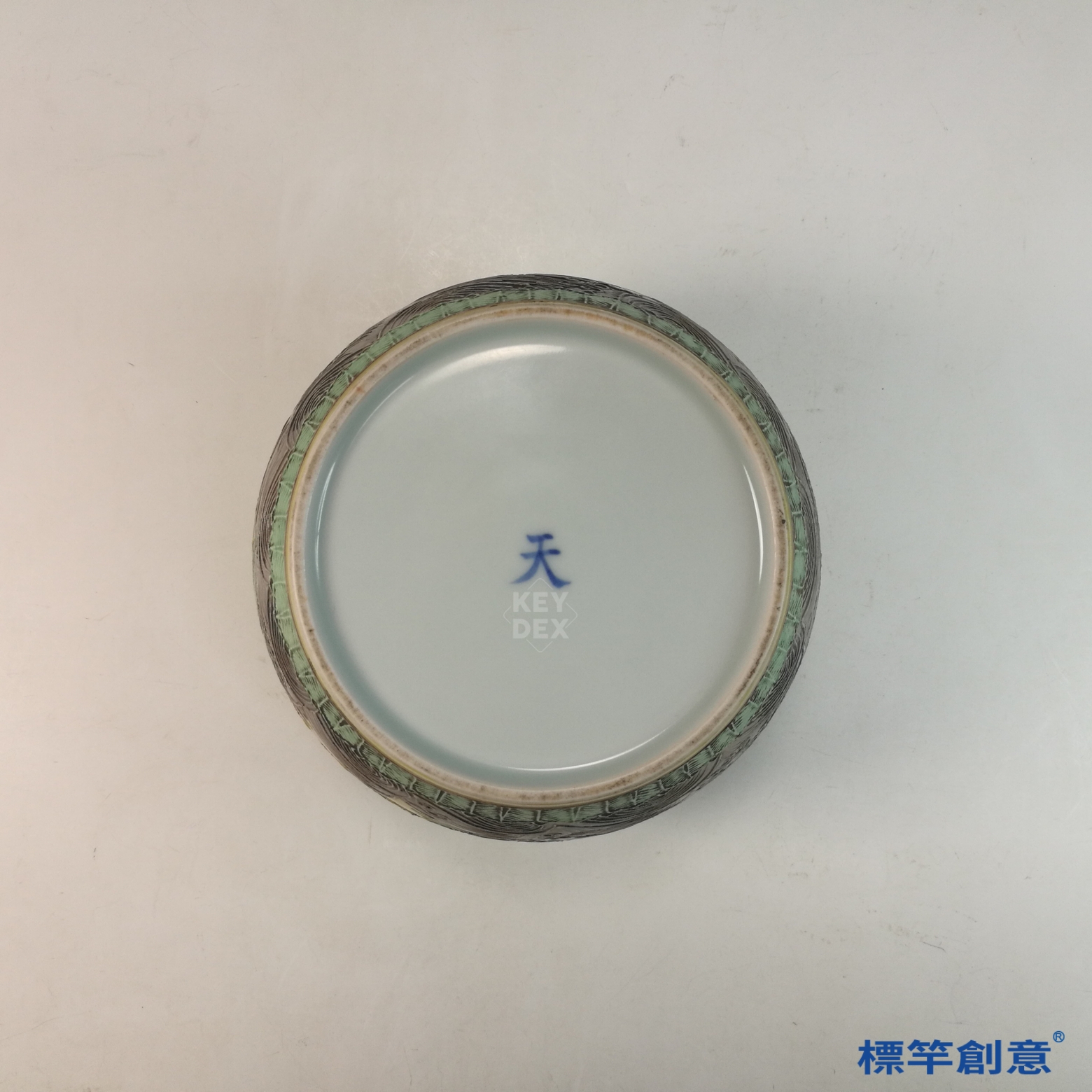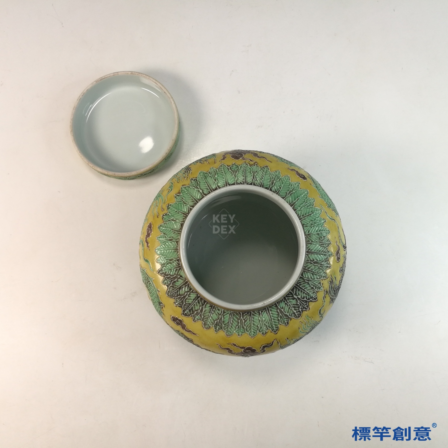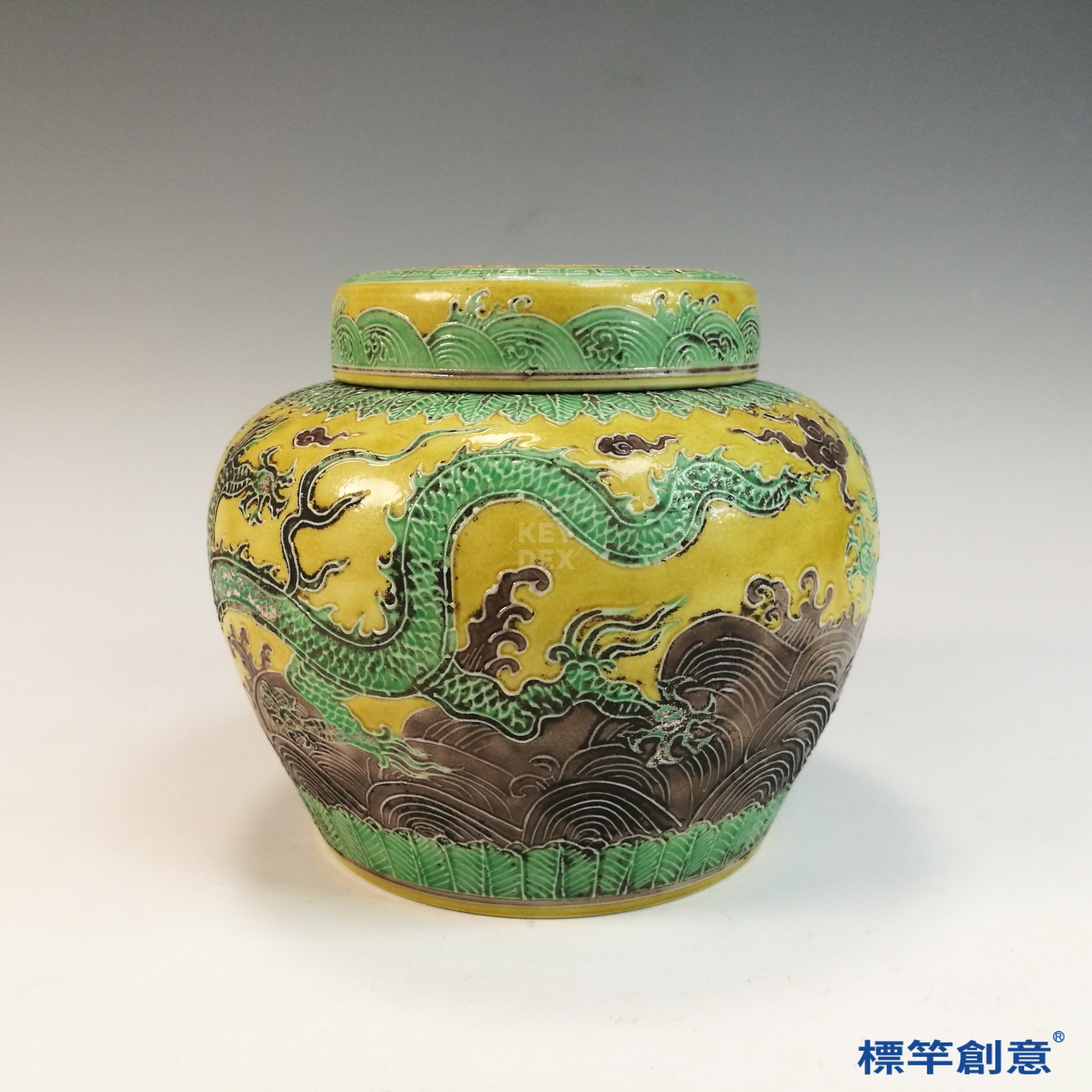 IA086 清康熙黃地綠褐彩凸線海浪龍紋天字款蓋罐