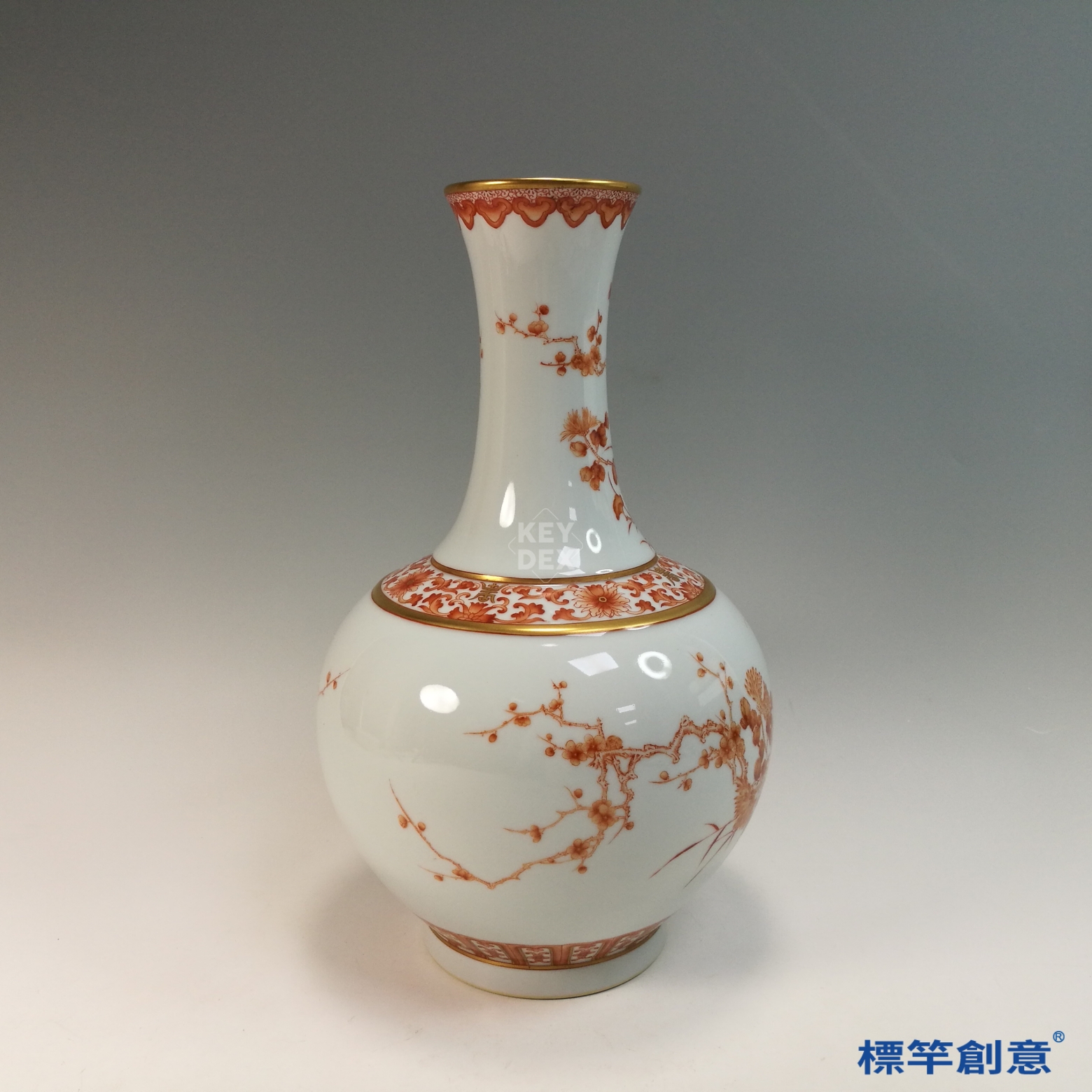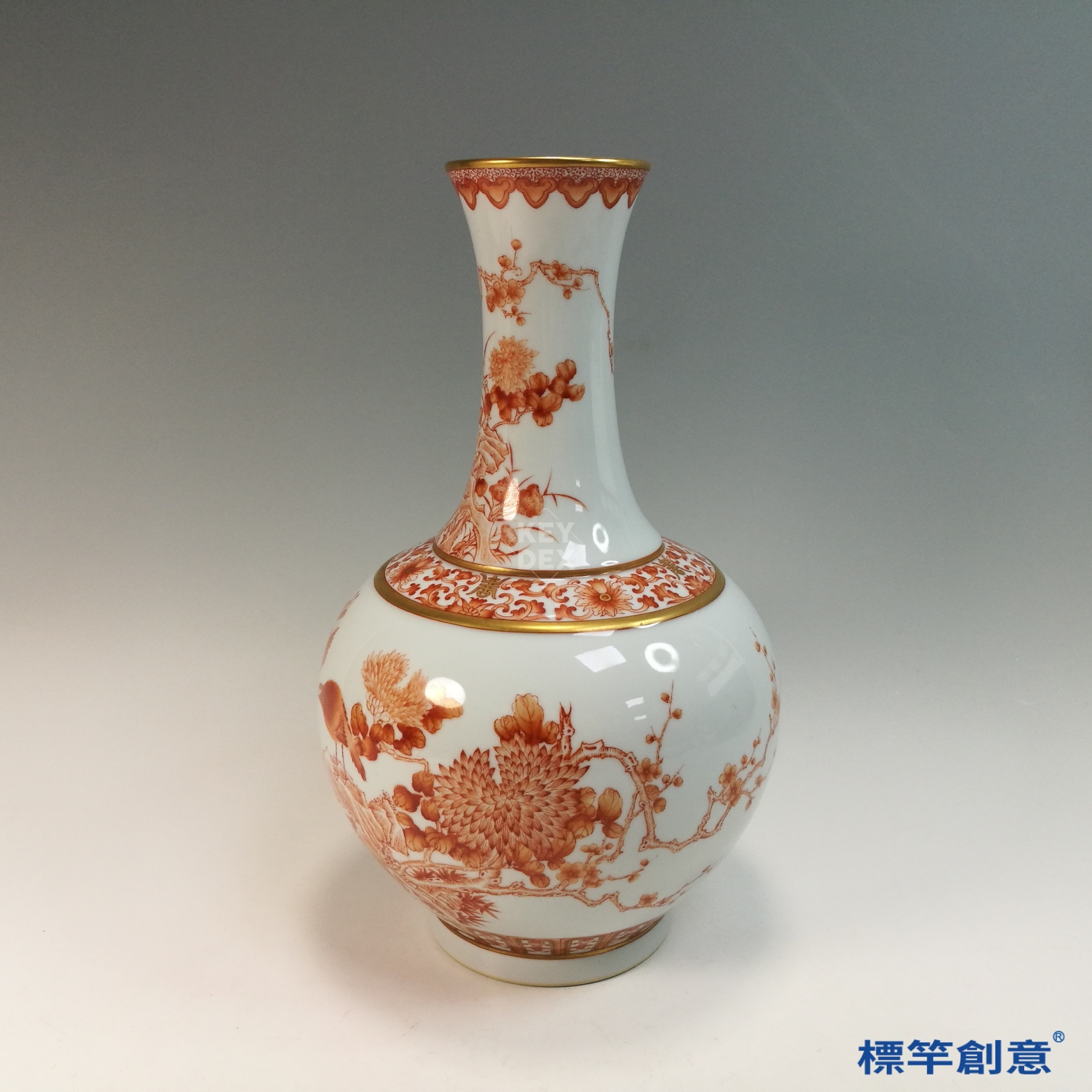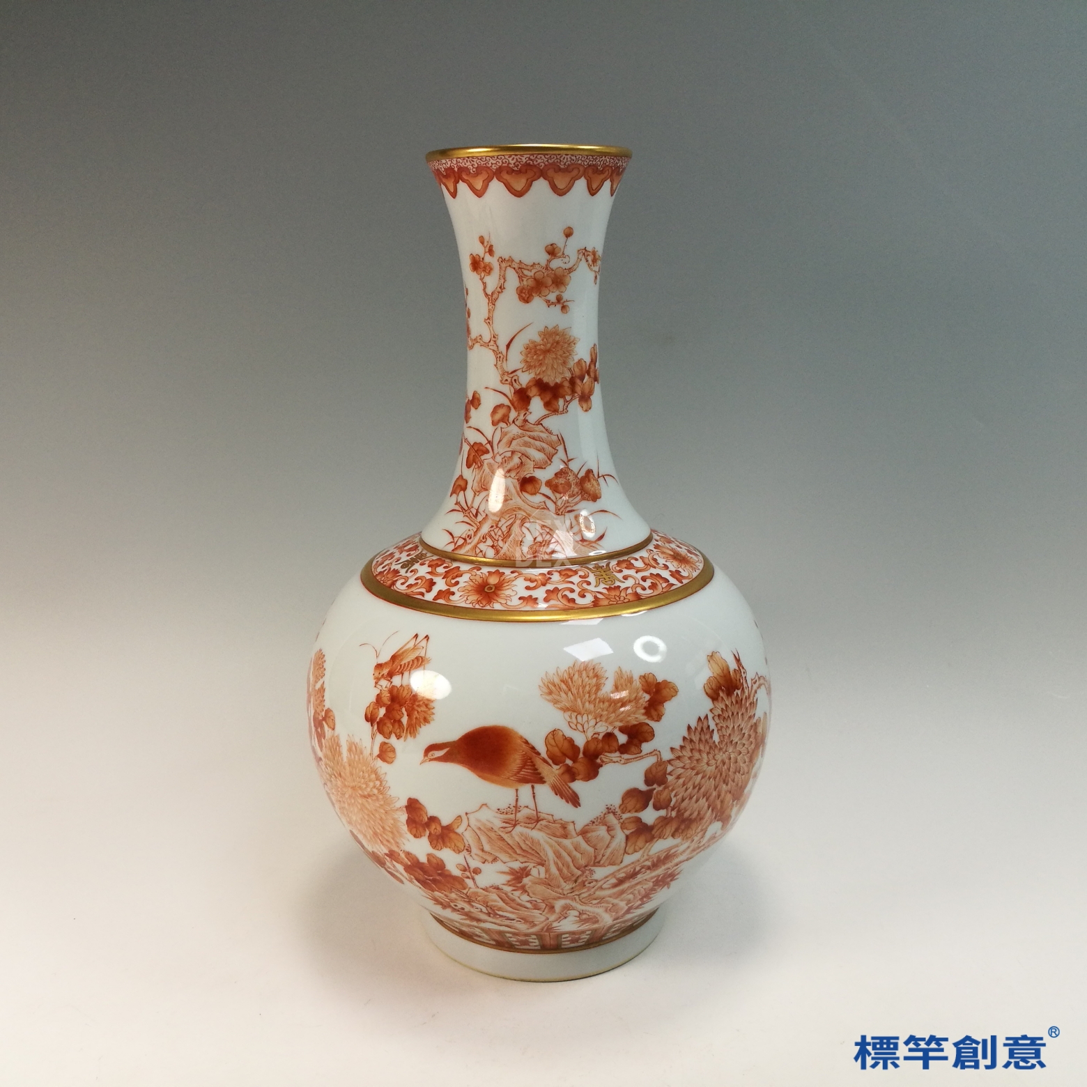 IA088 清代宣統景德鎮官窯礬紅彩花鳥描金賞瓶