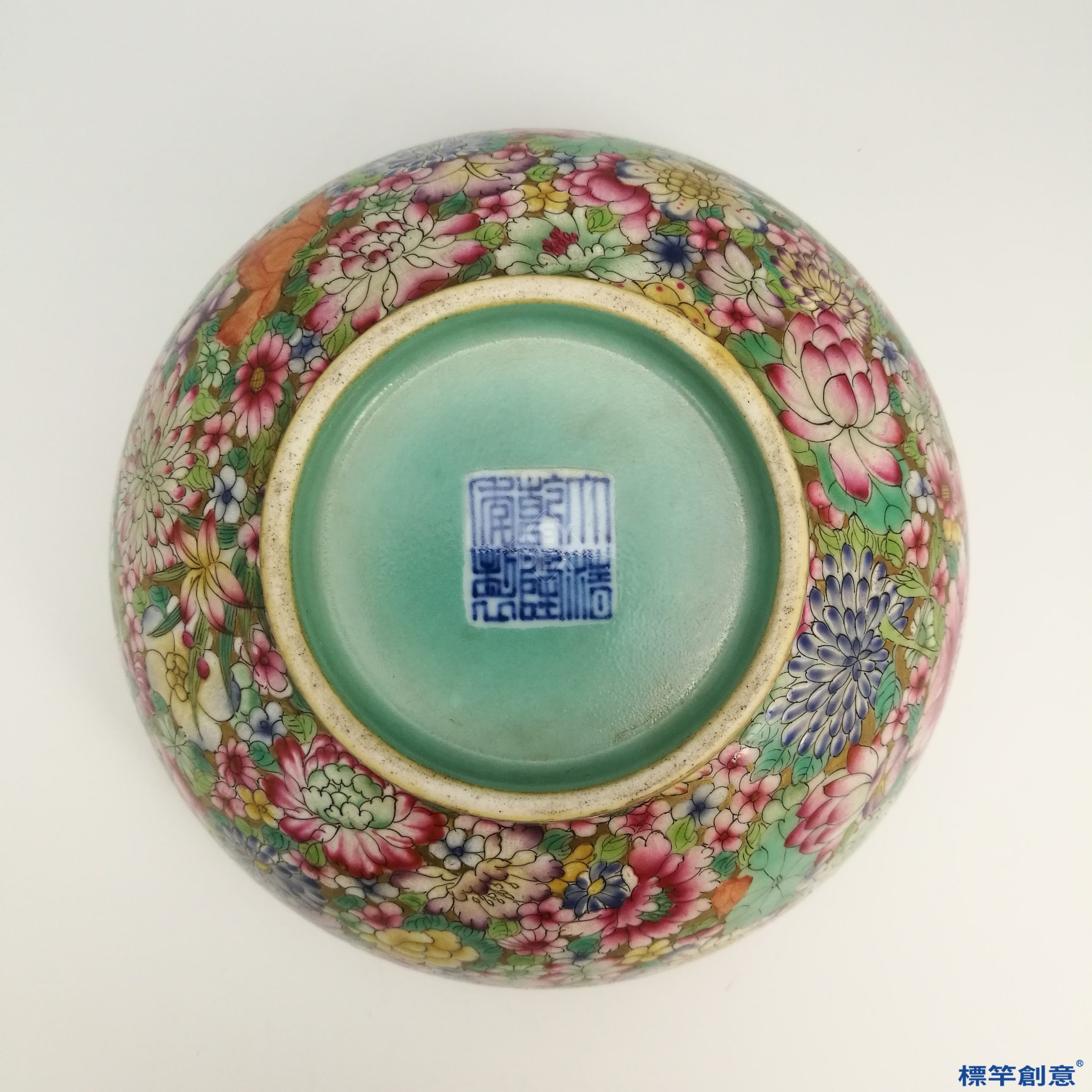 不管「百花不落地」是那一種説法,它是原創於清雍正時期,發揚於乾隆時期,寓意為「百花呈瑞,盛世昇平」,而居首功者是雍乾時期的督窯官「唐英」,他引用歐洲傳教士帶來的新釉料,也領導開發了中國自己的釉料,造就了「百花不落地」的多彩及藝術性。