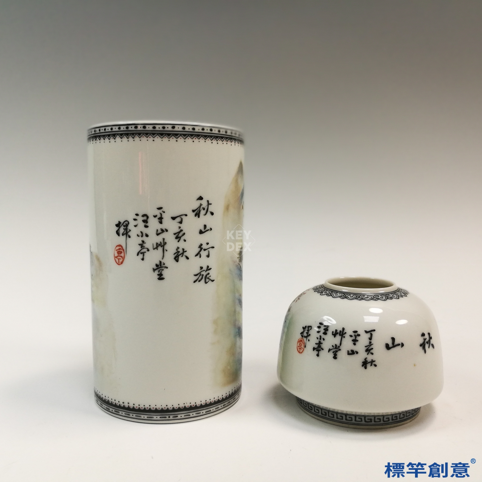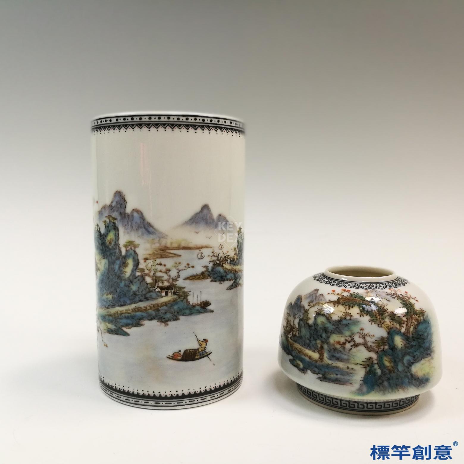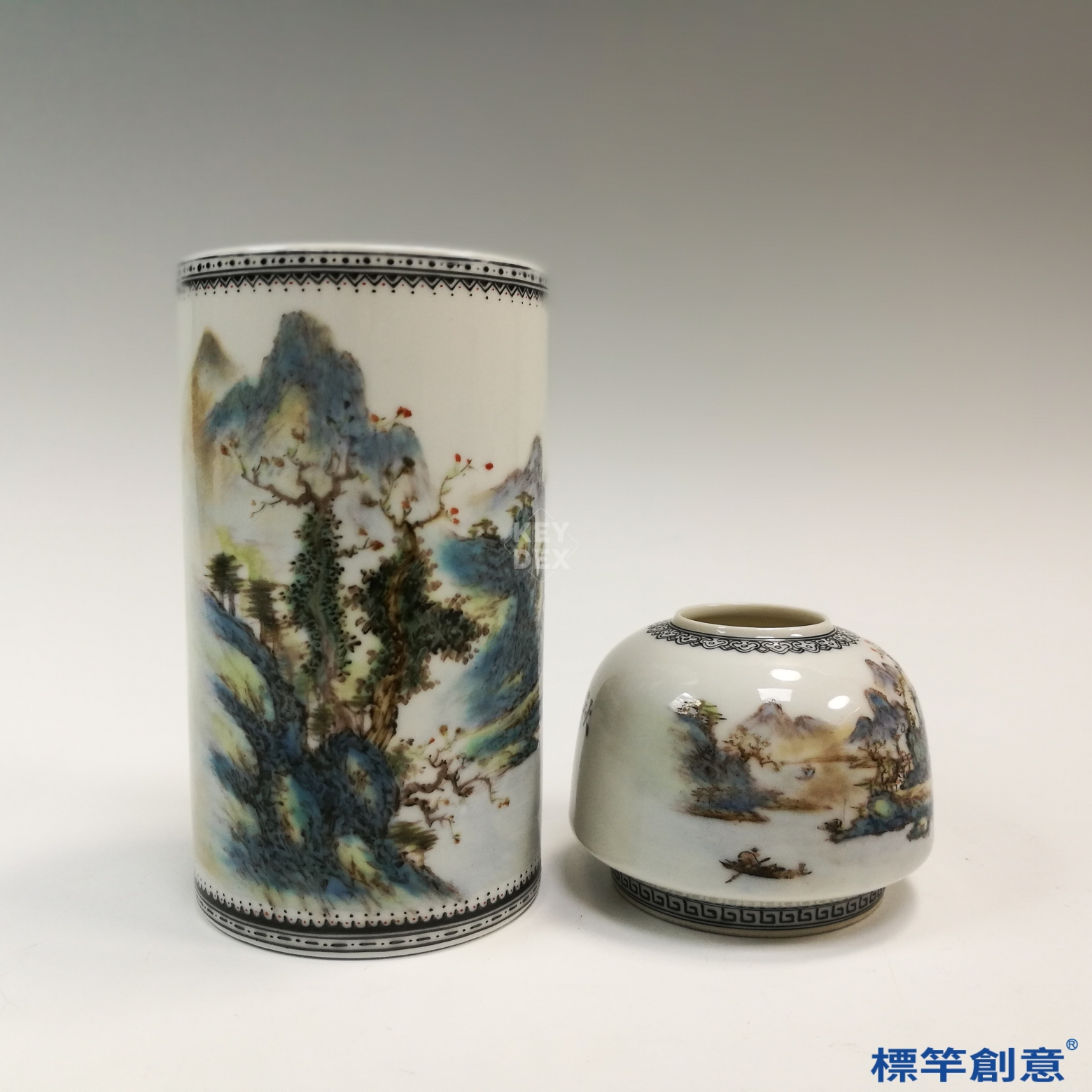 IB012 民國初年景德鎮窯 新粉彩汪小亭款山水筆洗筆筒一對