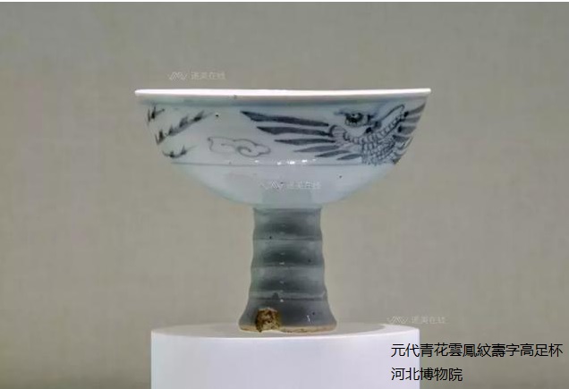 在論及元代瓷器的造型時,曾專文明確指出「高足杯」是元代的創新設計。嚴格的說這句話是錯的,應該說中空高圈足呈竹節狀的「高足杯」是元代的創新設計。標竿創意陶瓷科普公益網藏有「高足杯」十件,其中有六件比元代高足杯早,最早的一件是北齊相州窯白瓷高足杯,其實更早的一件遠在公元前4300年~2500年,發生在黃河下游流域(主要分布在今日的山東省、江蘇省)的大汶口文化,、.、當時就出現一個狀似高足杯的「回紋彩陶豆」,現收藏在山東省博物館,但漢代以後直接影響高足杯的出現,是來自西亞薩珊王朝的金銀器高足杯,以及來自西域的葡萄美酒夜光杯。