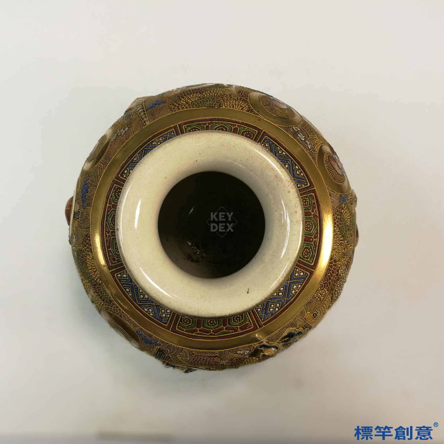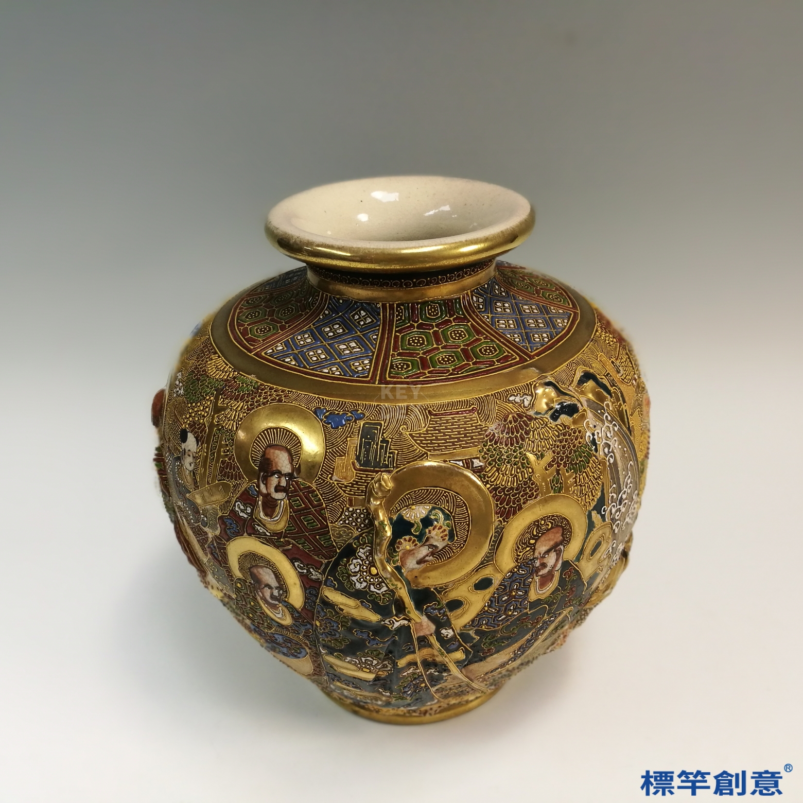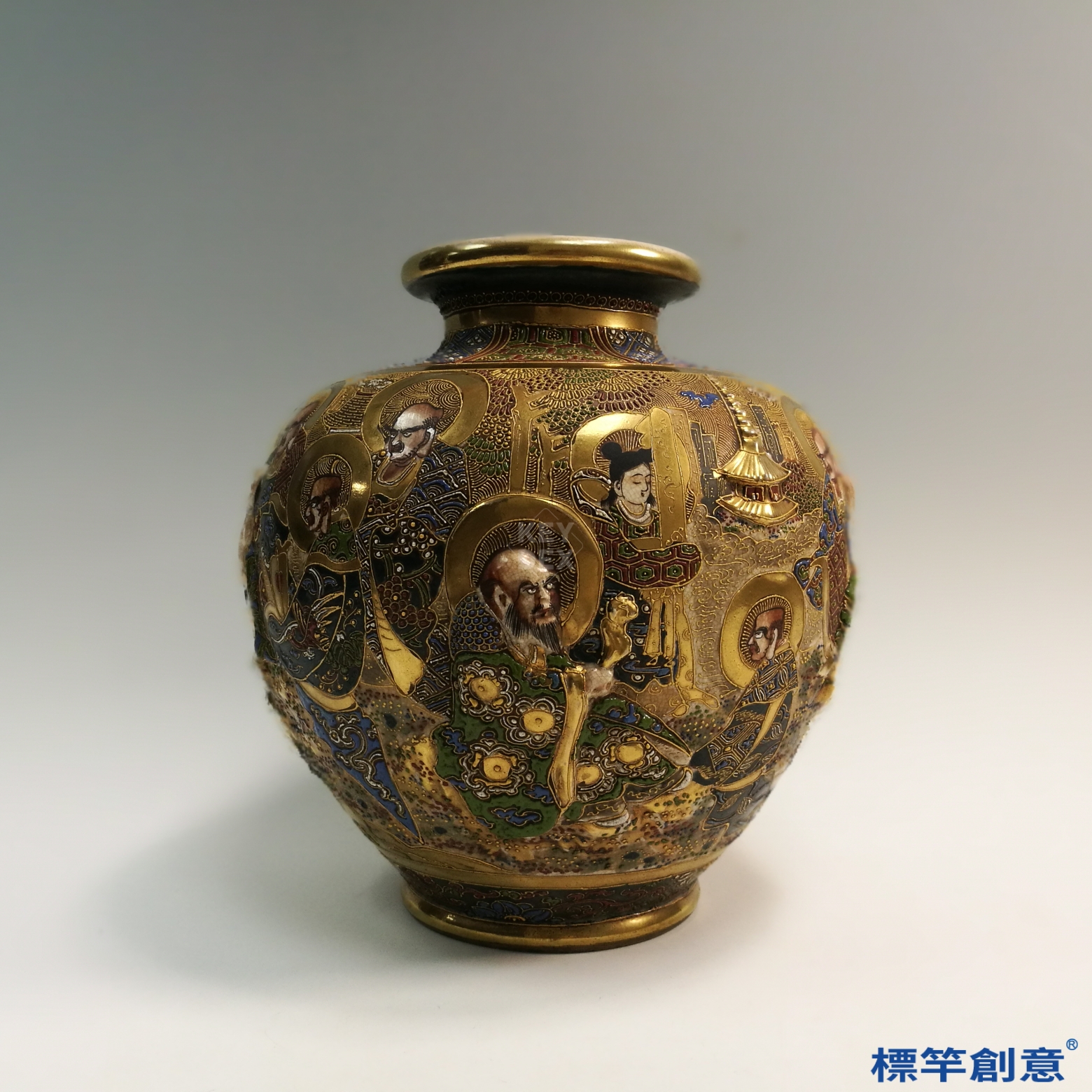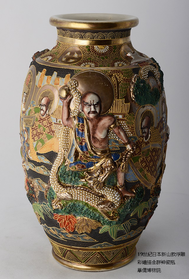 這薩摩燒小花瓶極為精緻,加上金色彩繪更是美輪美奐,它是日本明治/昭和時代,藪明山的作品(1853-1934),高度15.5公分,取名「薩摩燒金彩色繪送子觀音圖花瓶」。